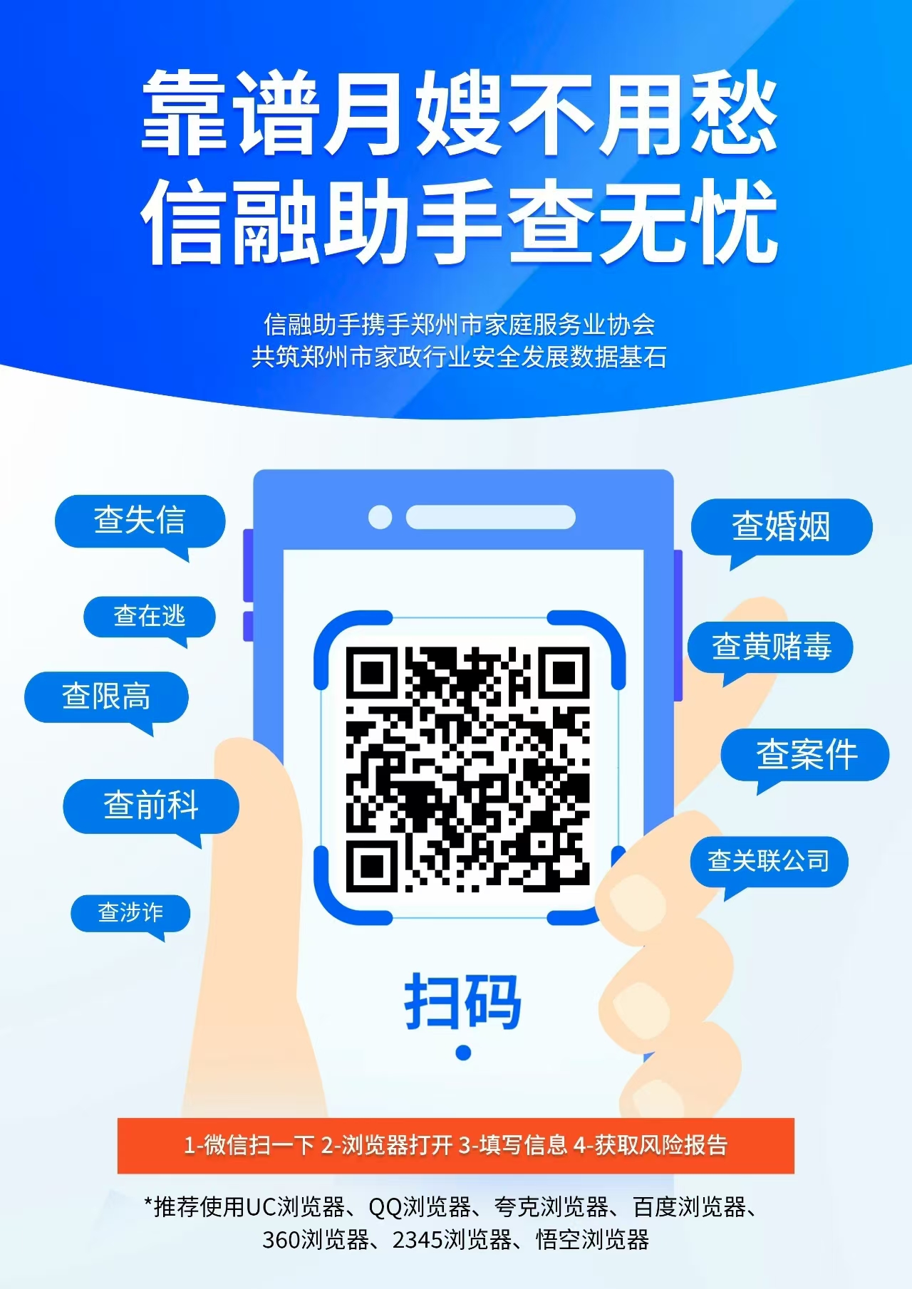 為規范家政服務(wù)行業(yè)用工管理、降低雇傭風(fēng)險,鄭州市家庭服務(wù)業(yè)協(xié)會(huì )聯(lián)合河南智芯技術(shù)轉移有限公司(信融助手)創(chuàng )新推出“家政從業(yè)人員信用查詢(xún)”服務(wù)。