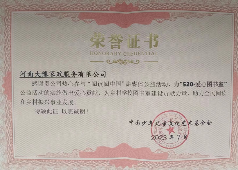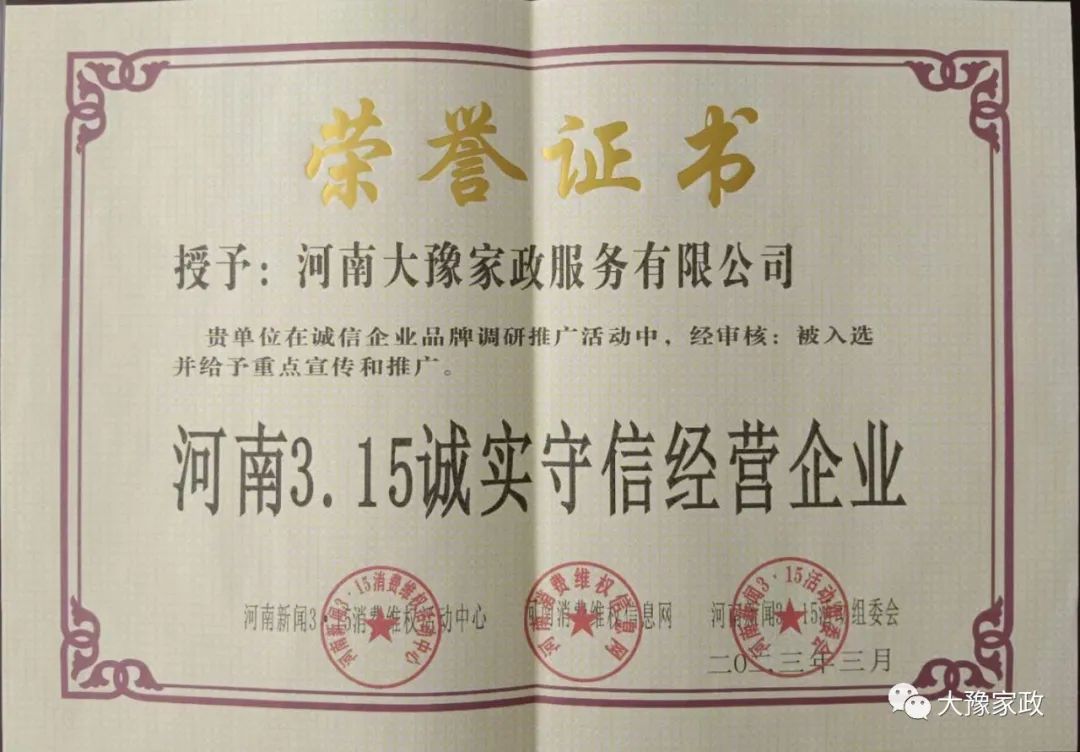 2023年3月9日上午,河南新聞3.15消費維權活動(dòng)中心、河南消費維權信息網(wǎng)、河南省新聞3.15活動(dòng)組委會(huì )授予:河南大豫家政服務(wù)有限公司 “河南3.15誠實(shí)守信經(jīng)營(yíng)企業(yè)”。