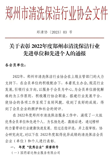 鄭州新豫物業(yè)管理有限公司,被鄭州市清洗保潔行業(yè)協(xié)會(huì )評為“2022年度優(yōu)秀企業(yè)”榮譽(yù)稱(chēng)號。