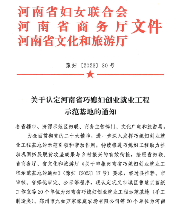喜報-大豫家政被評為河南省巧媳婦創(chuàng )業(yè)就業(yè)工程示范基地