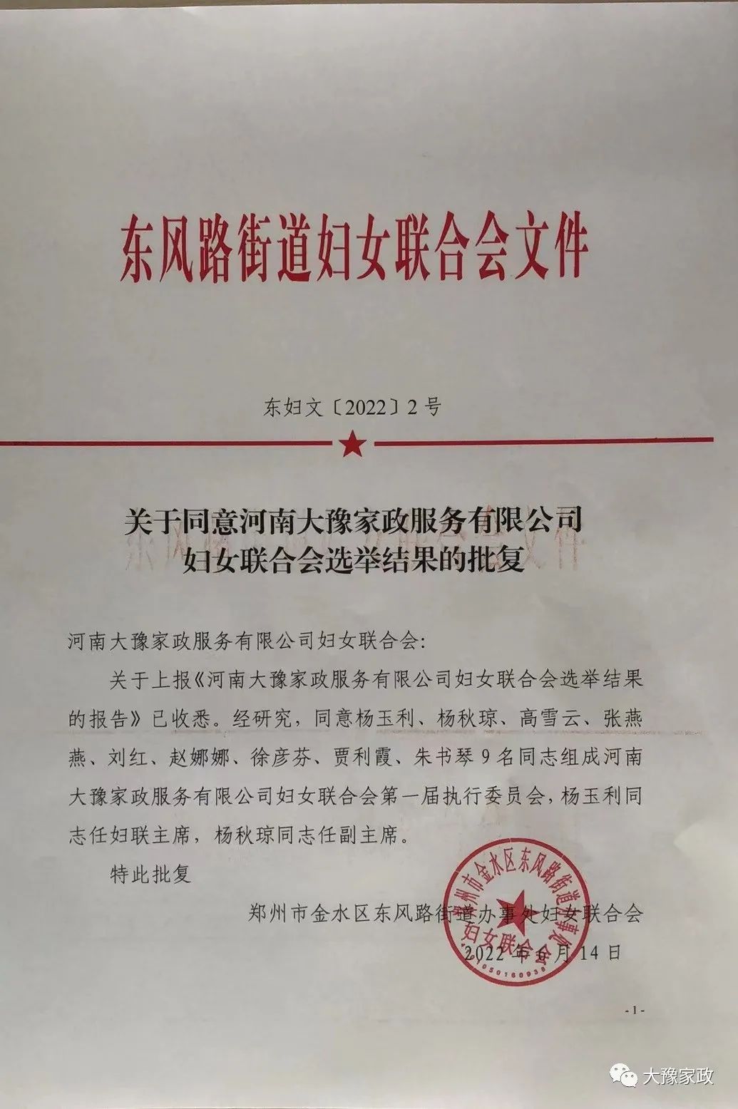 河南大豫家政服務(wù)有限公司于2022年6月14日在鄭州市金水區東風(fēng)路街道婦女聯(lián)合會(huì )下成立了河南大豫家政服務(wù)有限公司婦女聯(lián)合會(huì )。 大豫家政于2022年5月26日向金水區東風(fēng)路街道婦聯(lián)組織呈報了《河南大豫家政服務(wù)優(yōu)秀公...