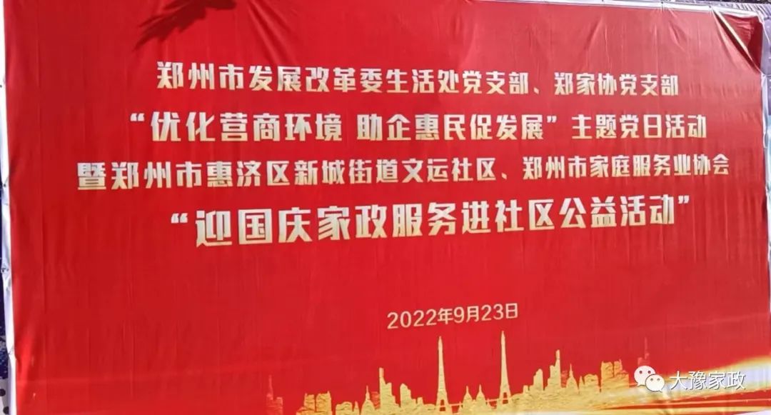 2022年9月23日上午,河南大豫家政服務(wù)有限公司參加由鄭州市惠濟區新城街道文云社區 、鄭州市家庭服務(wù)業(yè)協(xié)會(huì )舉辦的位于鄭州市惠濟新城街道文運社區的“迎國慶家政服務(wù)進(jìn)社區公益活動(dòng)”。