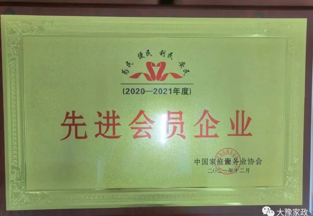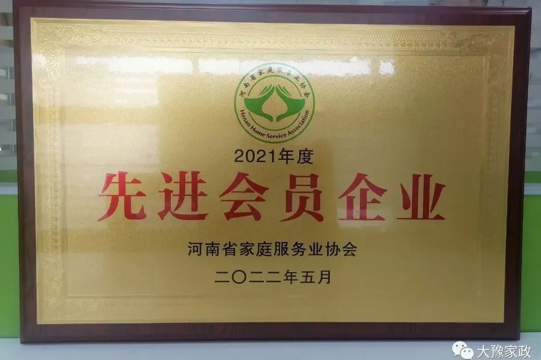 2022年6月13日,河南大豫家政服務(wù)有限公司分別被中國家庭服務(wù)業(yè)協(xié)會(huì )、河南省家庭服務(wù)業(yè)協(xié)會(huì )授予:“先進(jìn)會(huì )員企業(yè)”。