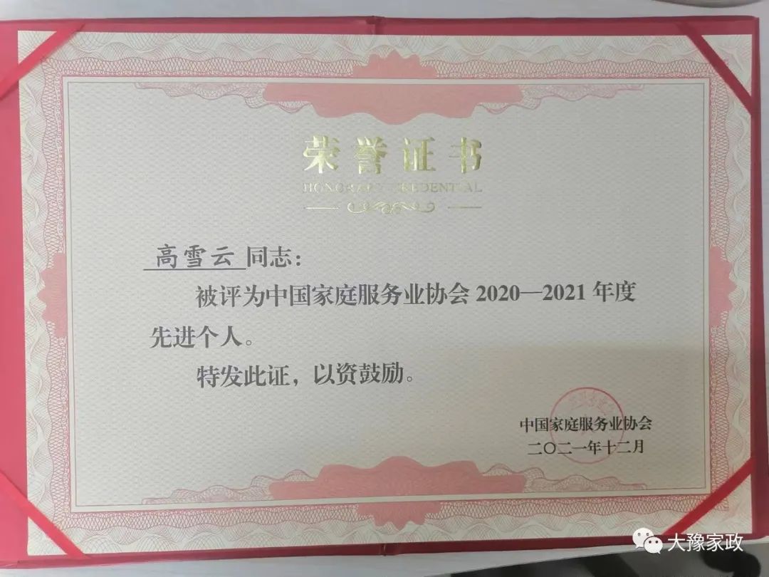 大豫家政管理人員高雪云被中家協(xié)評為:“中國家庭服務(wù)業(yè)協(xié)會(huì )2020-2021年度先進(jìn)個(gè)人”