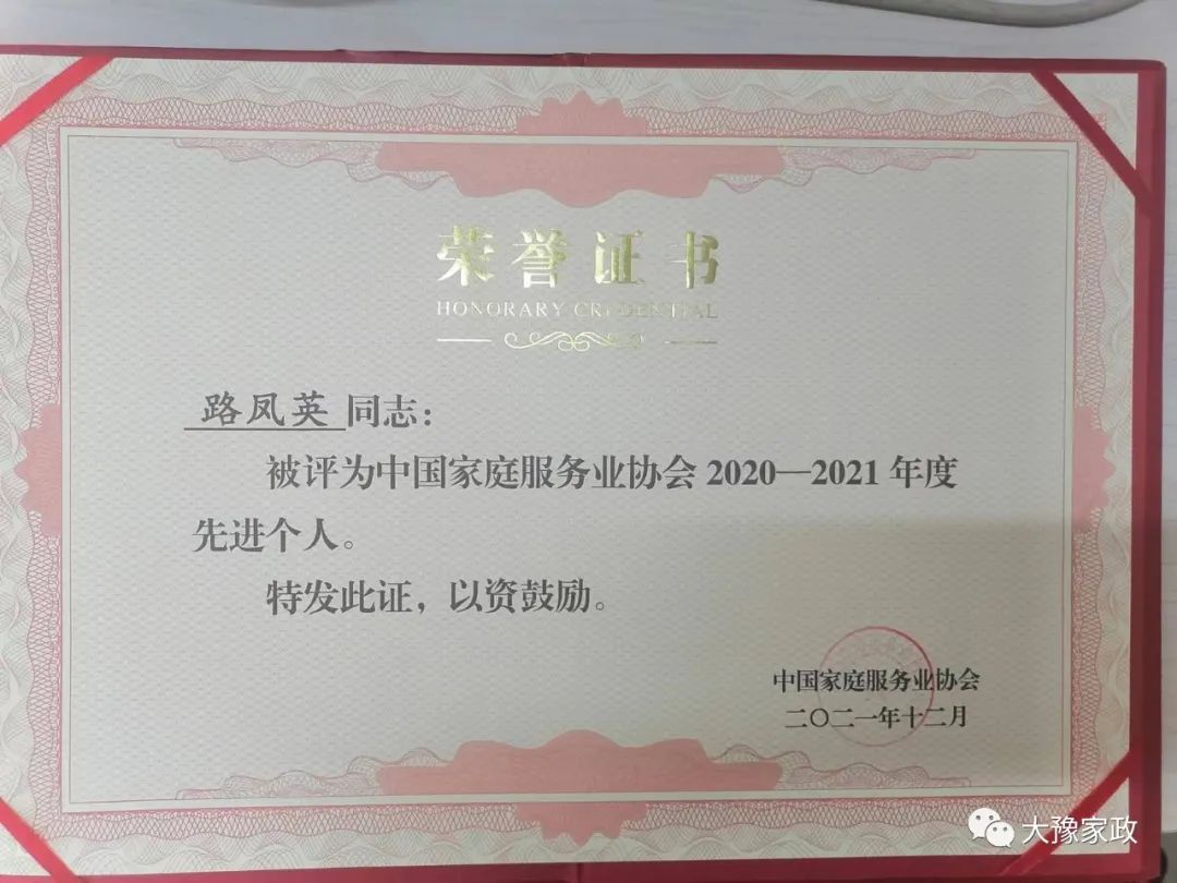 大豫家政員工路鳳英被中家協(xié)評為:“中國家庭服務(wù)業(yè)協(xié)會(huì )2020-2021年度先進(jìn)個(gè)人”