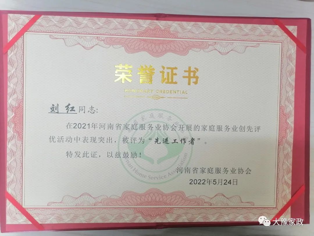 大豫家政員工劉紅被省家協(xié)評為:“先進(jìn)工作者”