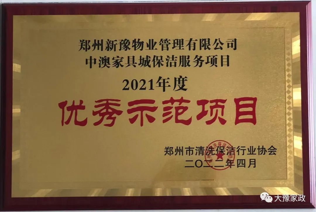 新豫物業(yè)中澳家具城保潔服務(wù)項目被評為《2021年度優(yōu)秀示范項目》。