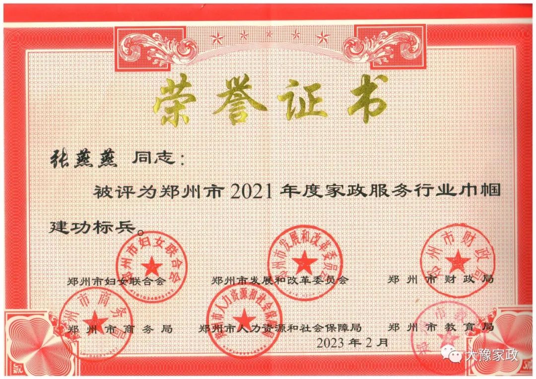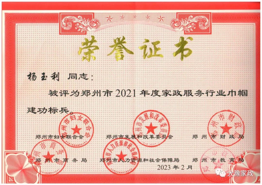 2023年3月31日,河南大豫家政服務(wù)有限公司員工楊玉利、張燕燕被鄭州市婦聯(lián)、發(fā)改委、財政局、商務(wù)局、人社局、教育局等單位評為鄭州市2021年度家政服務(wù)行業(yè)巾幗建功標兵。